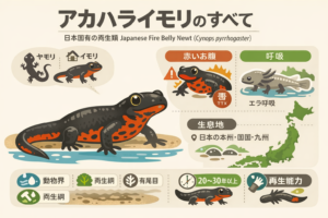 アカハライモリ(Cynops pyrrhogaster)は、日本固有種の両生類で、本州・四国・九州の池や水田、小川などに広く生息しています。