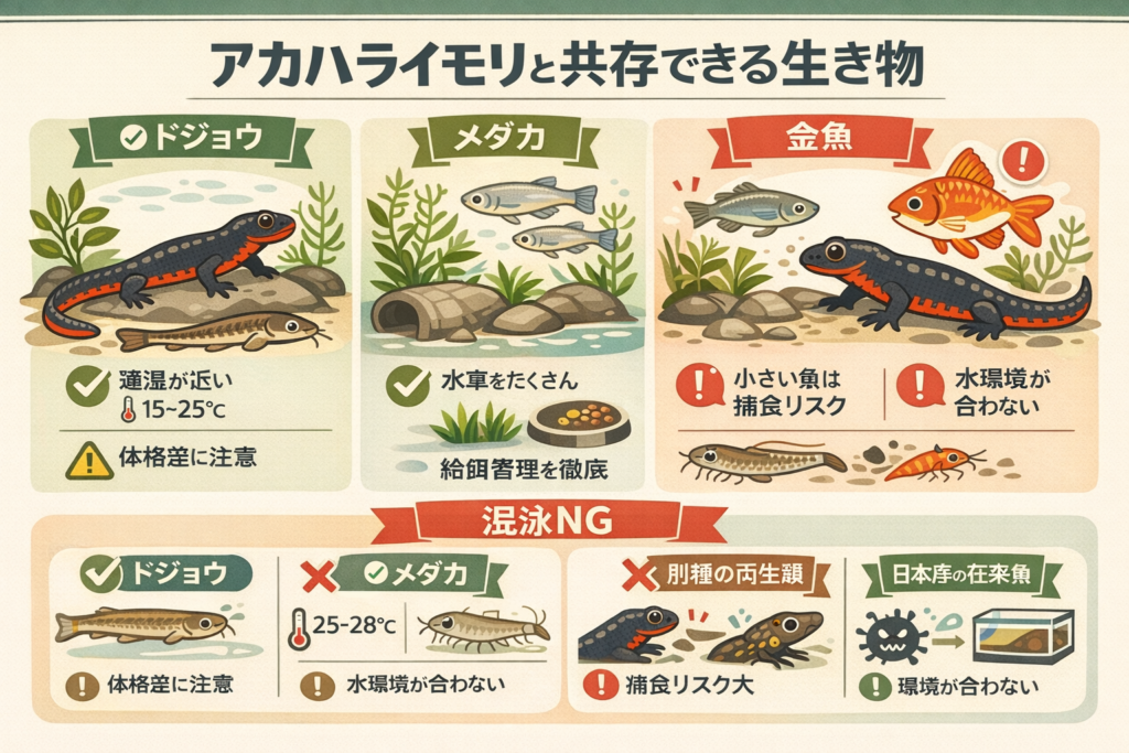 アカハライモリは日本の水辺に暮らす両生類ですので、同じ水温帯・水質帯を好む日本産の在来魚との相性は比較的良いケースがあります。
