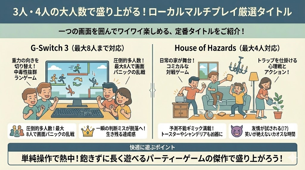 しかし、膨大なタイトルの中から、3人や4人で同時に遊べるマルチプレイ対応作品を探し出すのは意外と時間がかかるものです。