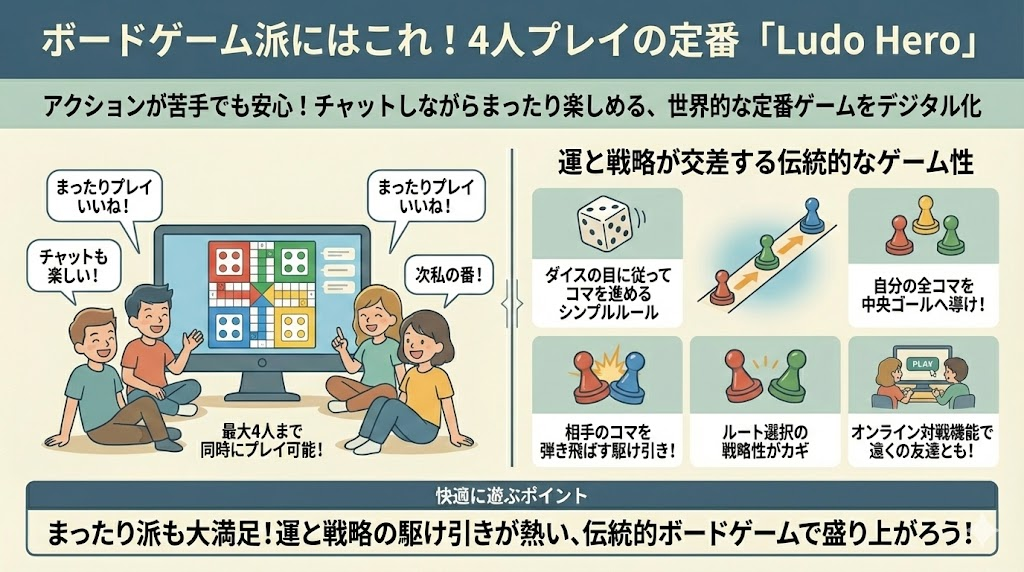 アクションゲームが苦手な方や、ゆっくりチャットを楽しみながら遊びたい方には、ボードゲームの「Ludo Hero(ルドー)」がおすすめです。